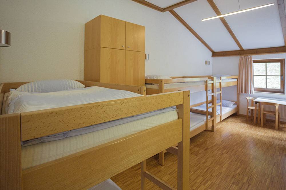 - 38 Betten in folgender Aufteilung: 4 x Einzelzimmer mit Dusche/WC, 7 x 4-Bettzimmer (Stockbetten), 1 x 6-Bettzimmer (Stockbetten),